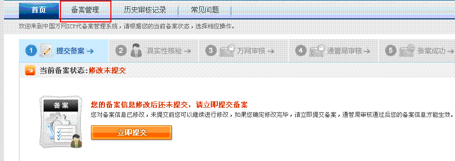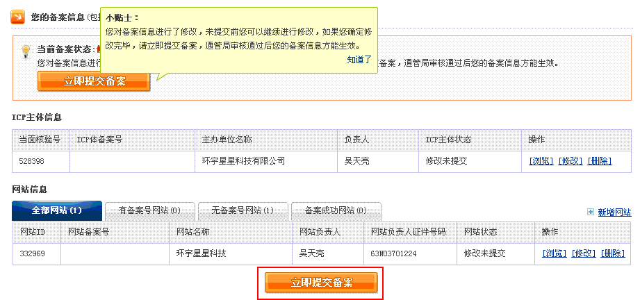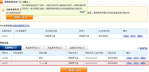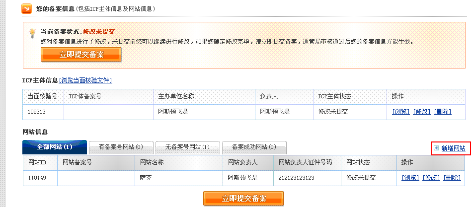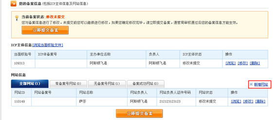 第7步:提交备案前,如果还需要增加或变更网站备案,可以继续进行操作,全部完成后,再点击“立即提交备案”按钮提交,提交后将至真实性核验阶段;
