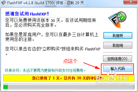在弹出的FlashFXP注册窗口中点“输入代码”,接着点确定,即完成FlashFXP注册。你可以用久使用这个版本的FlashFXP了