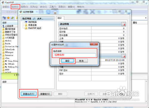 点FlashFXP菜单栏“站点-站点管理”打开站点管理器。然后点新建站点,输入站点名称(随意),确定。