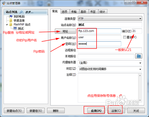 编辑站点管理器里新建的站点的相关信息,包括站点名称、地址、用户名称、密码等。编辑完成,点应用保存站点信息,点连接,FlashFXP开始连接FTP。