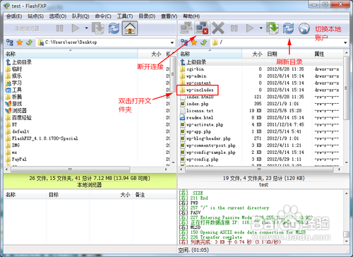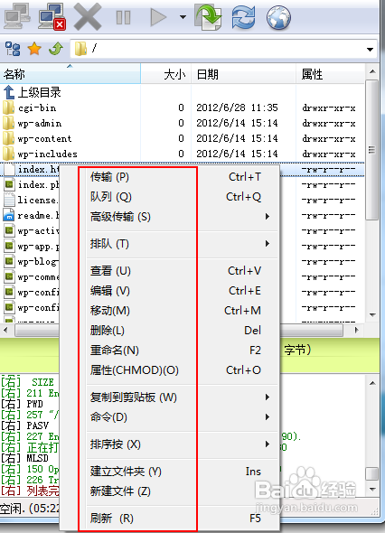 连接FTP成功后,右侧窗口会显示FTP服务器(站点)目录。你可以上传、下载、修改、删除FTP服务器(站点)中的内容了。