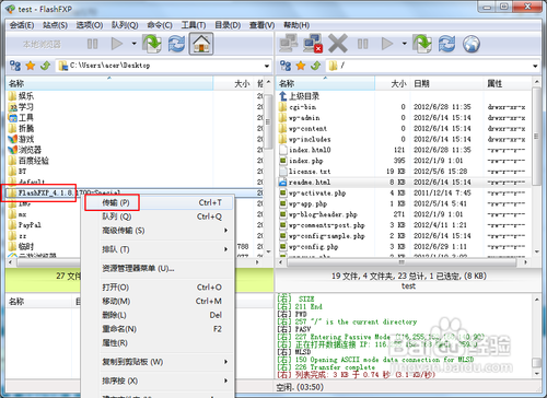 在左侧本地窗口选择文件或文件夹,右键-传输,即可把文件或文件夹上传到右侧的FTP服务器。操作简单。
