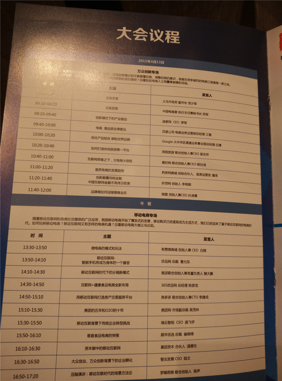 第一天的大会,上台的大咖主要有阿里巴巴、京东集团、1号店、海尔商城、国美在线、义乌购等老总和总裁们,上台为我们分享了大量的概念和”互联网+“的行业发展,比如苏宁副总裁李斌分享的,线上线下o2o的运营模式的变更和业态形态的蜕变,商务移动的大趋势,做好产品服务、品牌价值、个性创意的链条之间的相关性。国美在线陆宁为大家分享了大数据的应用,从收集、筛选、分类、计算、推送等过程,将在接下来的“互联网+”的背景下,大放异彩。应该说,本届大会,大咖云集,信息量都是量级的,移动商务化不可小觑的流量变现载体,微商、淘宝、京东、国美等各大电商,更多apps等应用的衍生,基于用户生活、出行、健康等常规的行为动态,同时也将常规细碎的手机屏幕、轮胎被扎等这些小细节都将囊括到apps的生活服务中,让移动端丰富而有多彩。