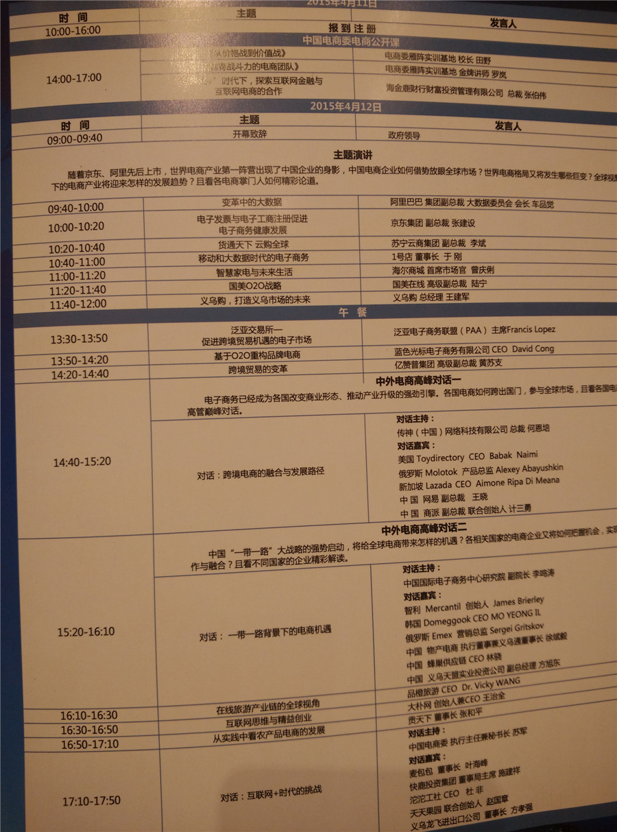 2015年4月11号,有幸与温州电子商务行业协会一同驱车前往有“中国小商品集散地”之称的义乌,参加由这剑圣人民政府主办、中国服务贸易协会电子商务委员会、中国电子商务产业联盟、义乌市人民政府联合承办的2015中国(义乌)世界电子商务大会于4月12-13日举行。 下图为本次协会参与的各个企业的代表、协会会长、局长和老总的合照。ps:亲,肯定不知道我站在哪个位置