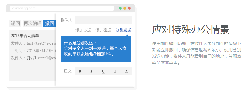 无需安装第三方APP,捆绑微信便可随时随地收发邮件,还能及时收到新邮件提醒。腾讯企业邮作为微信企业号的默认邮箱应用,邮箱通讯录已实现与企业号组织架构一键同步。