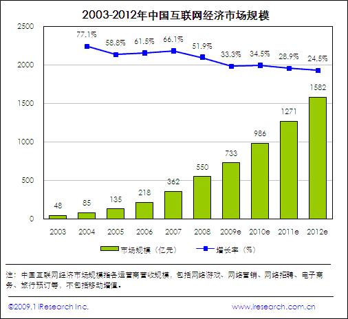2008年互联网经济市场规模达550亿元,年度增长放缓至51.9%