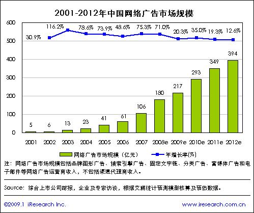 2008年网络广告市场规模达180亿元,年度增长达71.0%
