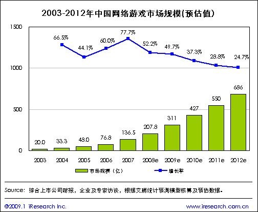 2008年中国网络游戏市场规模207.8亿,同比增长52.2%